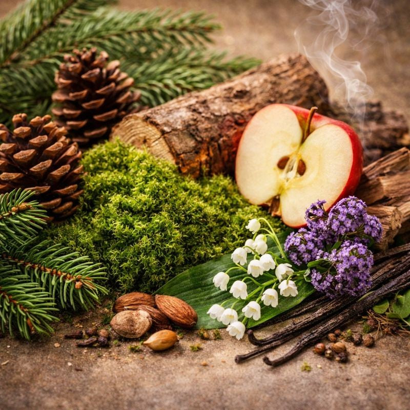 Cette fragrance boisée et fraîche évoque la magie des forêts de conifères et l’atmosphère apaisante des sous-bois. Dès l’ouverture, les notes vertes et résineuses de pin s’associent à une touche fruitée de pomme, apportant fraîcheur et naturel. Le cœur floral adoucit la composition avec des nuances délicates et légèrement poudrées. En fond, la mousse et le santal prolongent l’expérience dans une ambiance boisée profonde, chaleureuse et réconfortante.